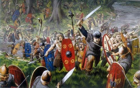 Римляне же были напуганы этим безупречным строем, а также диким грохотом и шумом, который издавали кельты. И действительно, у них было бессчетное множество горнистов и трубачей, и вдобавок все воины одновременно выкрикивали свои боевые кличи. В завершение Полибий говорит, что кельты уступали римлянам только вооружением, поскольку имели менее качественные мечи и щиты.
